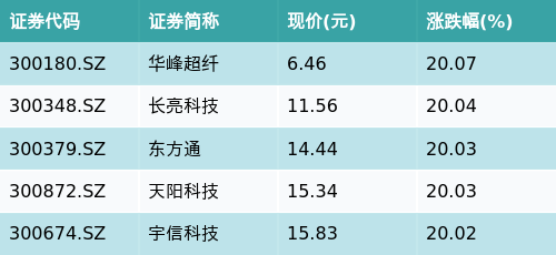 截至收盘,跨境支付(CIPS)主题涨跌幅最高的五只股票为:华峰超纤(300180.SZ)、长亮科技(300348.SZ)、东方通(300379.SZ)、天阳科技(300872.SZ)与宇信科技(300674.SZ)。详情见下表: