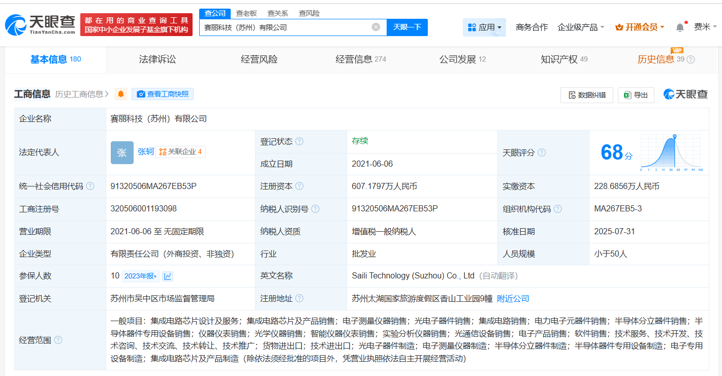 南方财经8月4日电,天眼查App显示,近日,赛丽科技(苏州)有限公司发生工商变更,原股东苏州吴中甪直端金苗科创投资合伙企业(有限合伙)、苏州市东吴领军科创投资合伙企业(有限合伙)、青岛掌鸣元晰股权投资合伙企业(有限合伙)退出,新增广西腾讯创业投资有限公司、北京平安富通投资有限责任公司、苏州锦秀太湖文锦一期股权投资合伙企业(有限合伙)为股东。该公司成立于2021年6月,法定代表人为张轲,注册资本约607万人民币,经营范围包括集成电路芯片设计及服务、集成电路芯片及产品销售、电子测量仪器销售等。股东信息显示,该公司现由张轲、上海赛瑞思企业管理合伙企业(有限合伙)及上述新增股东等共同持股。官网显示,该公司是无晶圆芯片设计公司。