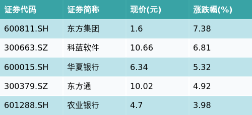 截至午间收盘,跨境支付(CIPS)主题涨跌幅最高的五只股票为:东方集团(600811.SH)、科蓝软件(300663.SZ)、华夏银行(600015.SH)、东方通(300379.SZ)与农业银行(601288.SH)。详情见下表:
