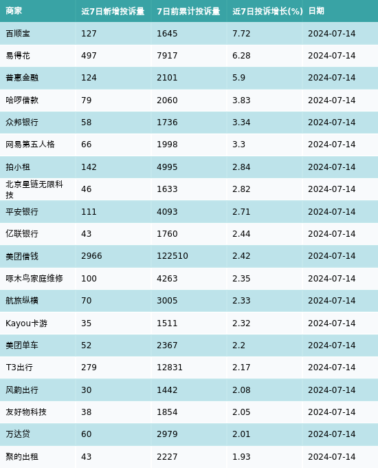 黑猫投诉:百顺宝、易得花和普惠金融近7日投诉增长率最高(7月8日-7月14日)