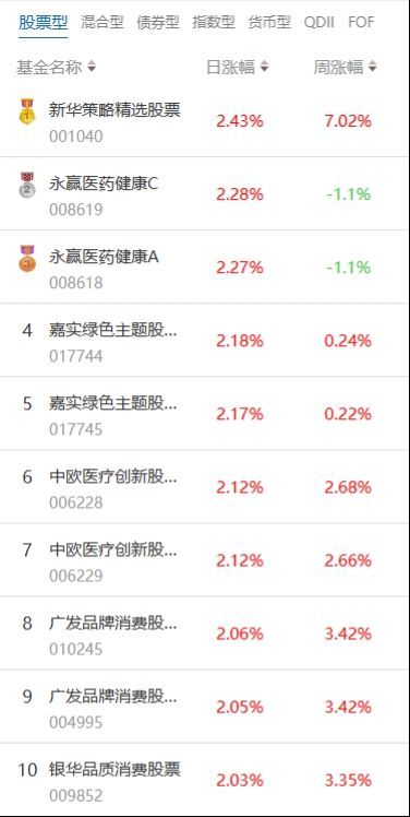 南方财经4月30日电,根据南财基金通数据,2025年04月29日当日收益靠前的股票型基金包括:新华策略精选股票型证券投资基金(001040,日收益2.43%);永赢医药健康股票型证券投资基金(008619,日收益2.28%);嘉实绿色主题股票型发起式证券投资基金(017744,日收益2.18%)等。收益较低的股票型基金包括:长城量化精选股票型证券投资基金(006926,日收益-1.89%);嘉实清洁能源股票型发起式证券投资基金(017074,日收益-1.21%);建信食品饮料行业股票型证券投资基金(014864,日收益-1.02%)等。