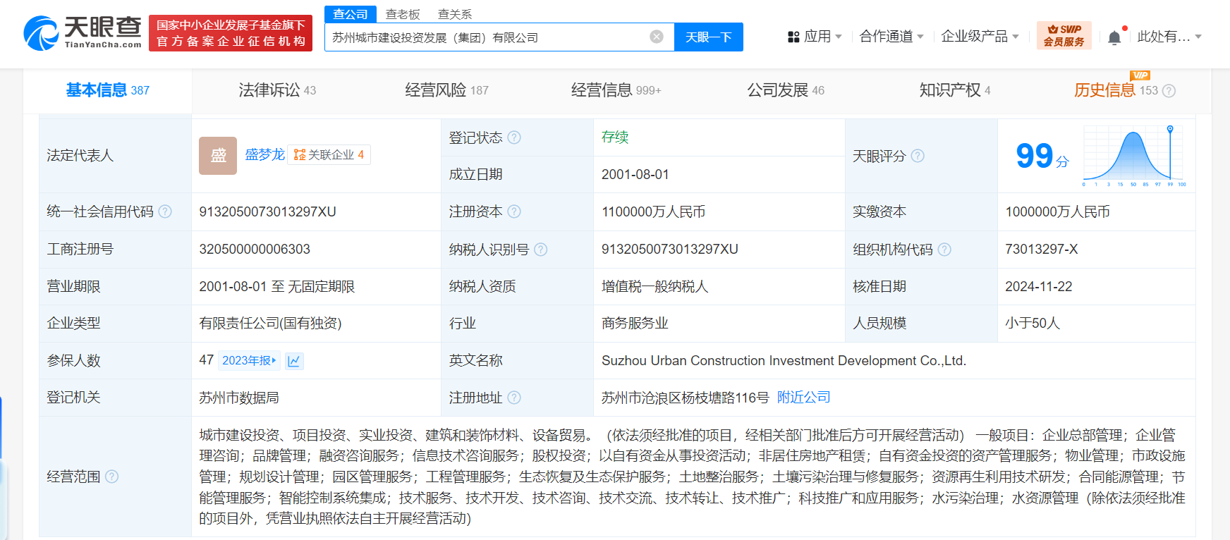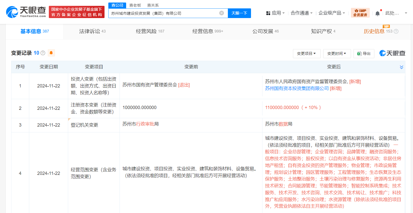 南方财经11月29日电,天眼查App显示,近日,苏州城市建设投资发展(集团)有限公司发生工商变更,苏州市国有资产管理委员会退出股东行列,新增苏州市人民政府国有资产监督管理委员会、苏州国有资本投资集团有限公司为股东,注册资本由100亿人民币增至110亿人民币,同时,经营范围新增企业总部管理、企业管理咨询、以自有资金从事投资活动、非居住房地产租赁、自有资金投资的资产管理服务、物业管理、资源再生利用技术研发等。苏州城市建设投资发展(集团)有限公司成立于2001年8月,法定代表人为盛梦龙。