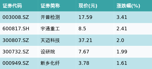 截至收盘,河南主题涨跌幅最高的五只股票为:开普检测(003008.SZ)、宇通重工(600817.SH)、天迈科技(300807.SZ)、设研院(300732.SZ)与新乡化纤(000949.SZ)。详情见下表: