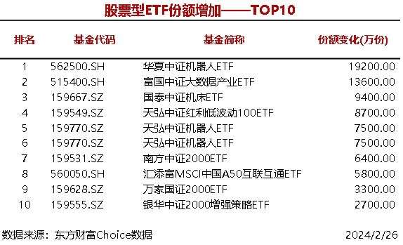 南方财经2月27日电,据东方财富Choice数据统计,昨日共2只股票型ETF当日份额增加超1亿份,华夏中证机器人ETF增加1.92亿份,富国中证大数据产业ETF增加1.36亿份。