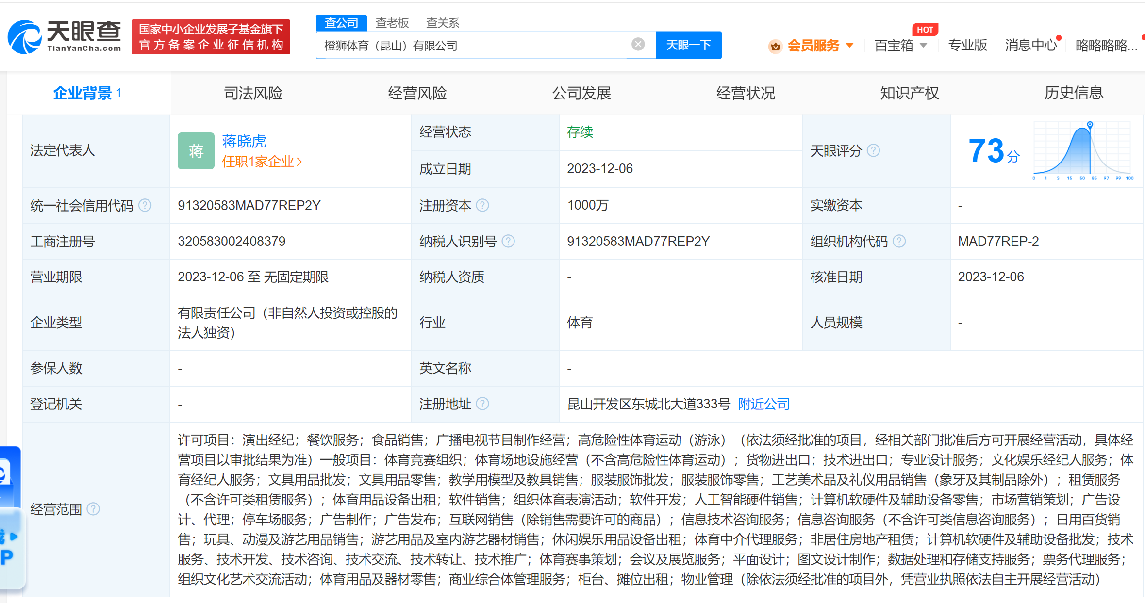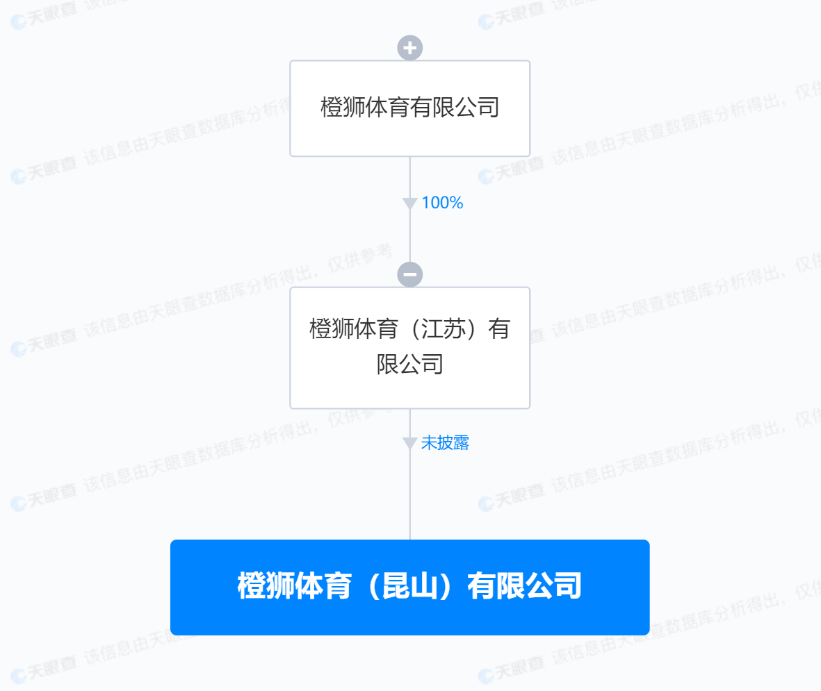 南方财经12月7日电,天眼查App显示,近日,橙狮体育(昆山)有限公司成立,法定代表人为蒋晓虎,注册资本1000万人民币,经营范围含演出经纪、广播电视节目制作经营、体育竞赛组织、体育场地设施经营、商业综合体管理服务等。股权全景穿透图显示,该公司由橙狮体育(江苏)有限公司全资持股,后者为阿里巴巴旗下橙狮体育有限公司子公司。