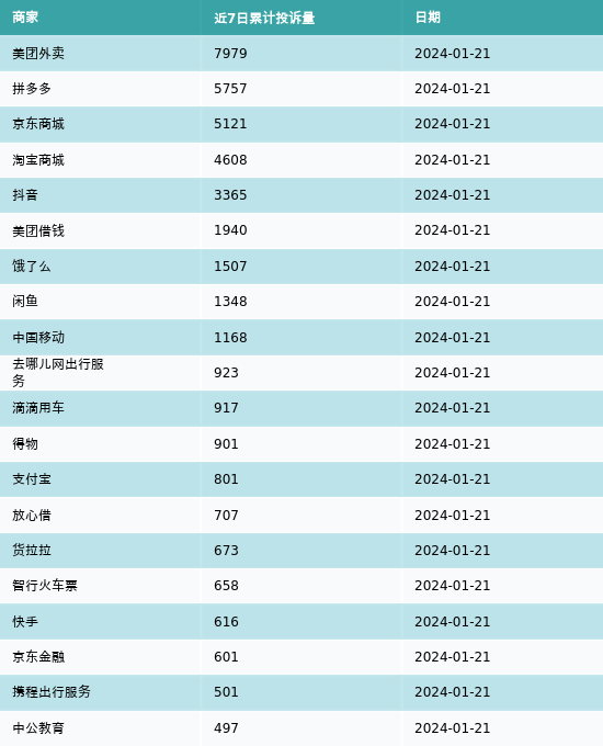 黑猫投诉:美团外卖、拼多多和京东商城近7日投诉量最高(1月15日-1月21日)