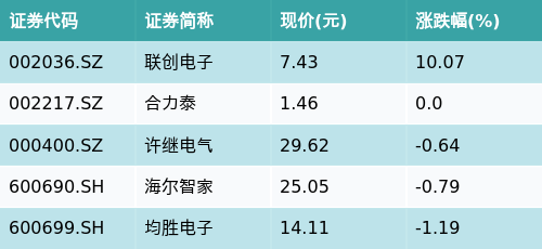 截至收盘,无线充电主题涨跌幅最高的五只股票为:联创电子(002036.SZ)、合力泰(002217.SZ)、许继电气(000400.SZ)、海尔智家(600690.SH)与均胜电子(600699.SH)。详情见下表: