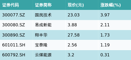 截至收盘,石墨电极主题涨跌幅最高的五只股票为:国民技术(300077.SZ)、易成新能(300080.SZ)、翔丰华(300890.SZ)、宝泰隆(601011.SH)与云煤能源(600792.SH)。详情见下表: