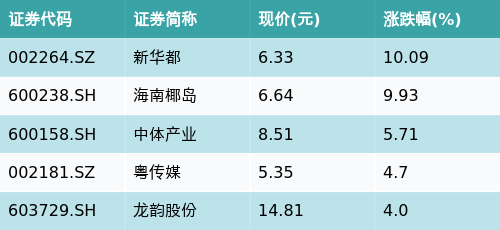 截至早盘收盘,互联网彩票主题涨跌幅最高的五只股票为:新华都(002264.SZ)、海南椰岛(600238.SH)、中体产业(600158.SH)、粤传媒(002181.SZ)与龙韵股份(603729.SH)。详情见下表:
