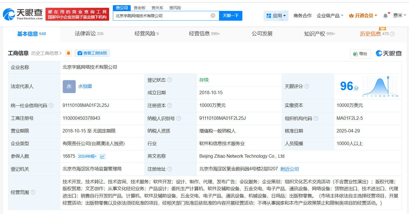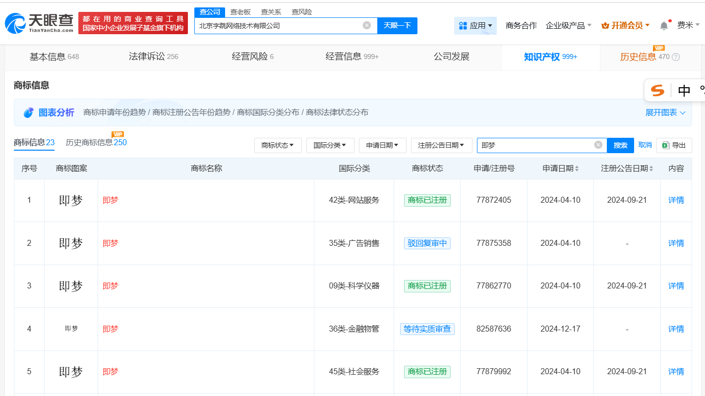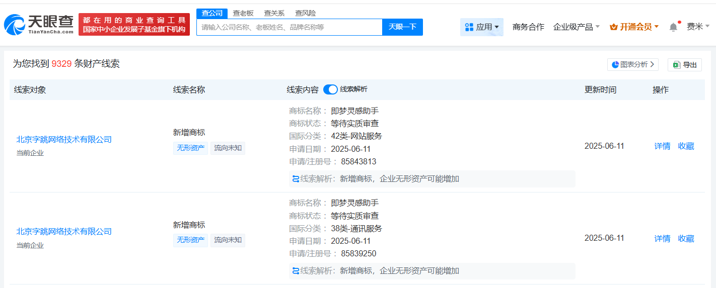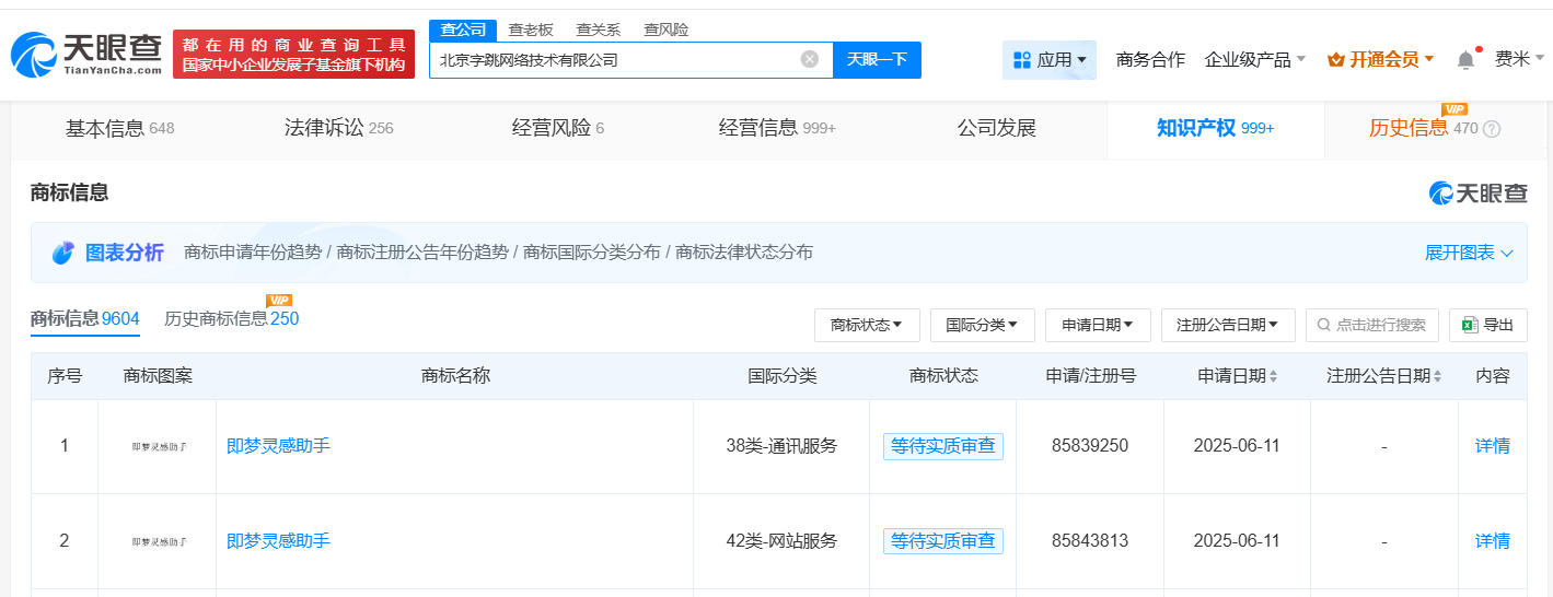 南方财经7月4日电,天眼查财产线索信息显示,近日,北京字跳网络技术有限公司申请注册“即梦灵感助手”商标,国际分类为通讯服务、网站服务,当前商标状态均为等待实质审查。此前,该公司已申请注册“即梦”“即梦AI迷你剧场”商标,其中部分商标已成功注册。该公司成立于2018年10月,法定代表人为水恒熠,注册资本1亿美元,经营范围包括会议服务、企业策划、版权代理等,由抖音集团(香港)有限公司全资持股。公开信息显示,即梦AI是一款为创意爱好者打造的AI表达平台,具有AI图片创作、视频创作、探索创意世界等功能。