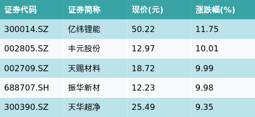截至午间收盘,正极材料主题涨跌幅最高的五只股票为:亿纬锂能(300014.SZ)、丰元股份(002805.SZ)、天赐材料(002709.SZ)、振华新材(688707.SH)与天华超净(300390.SZ)。详情见下表: