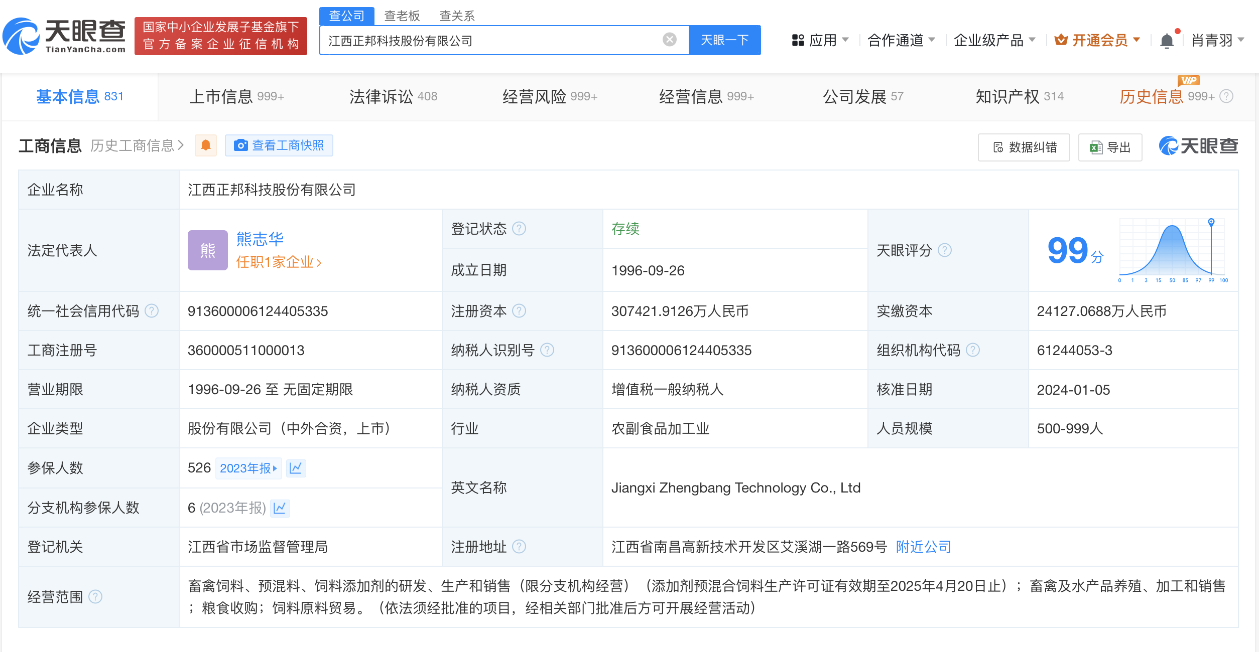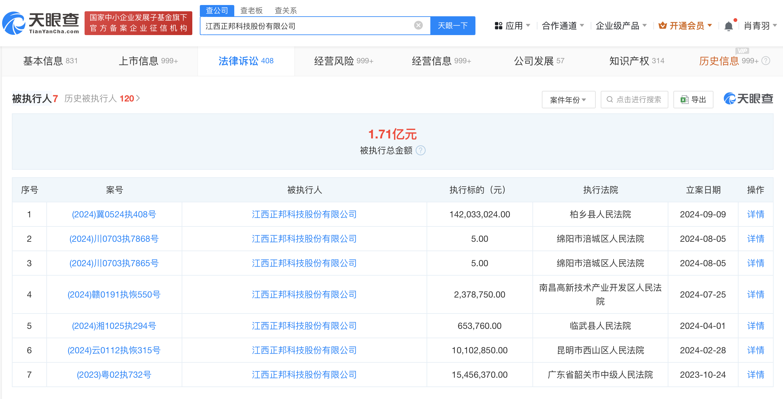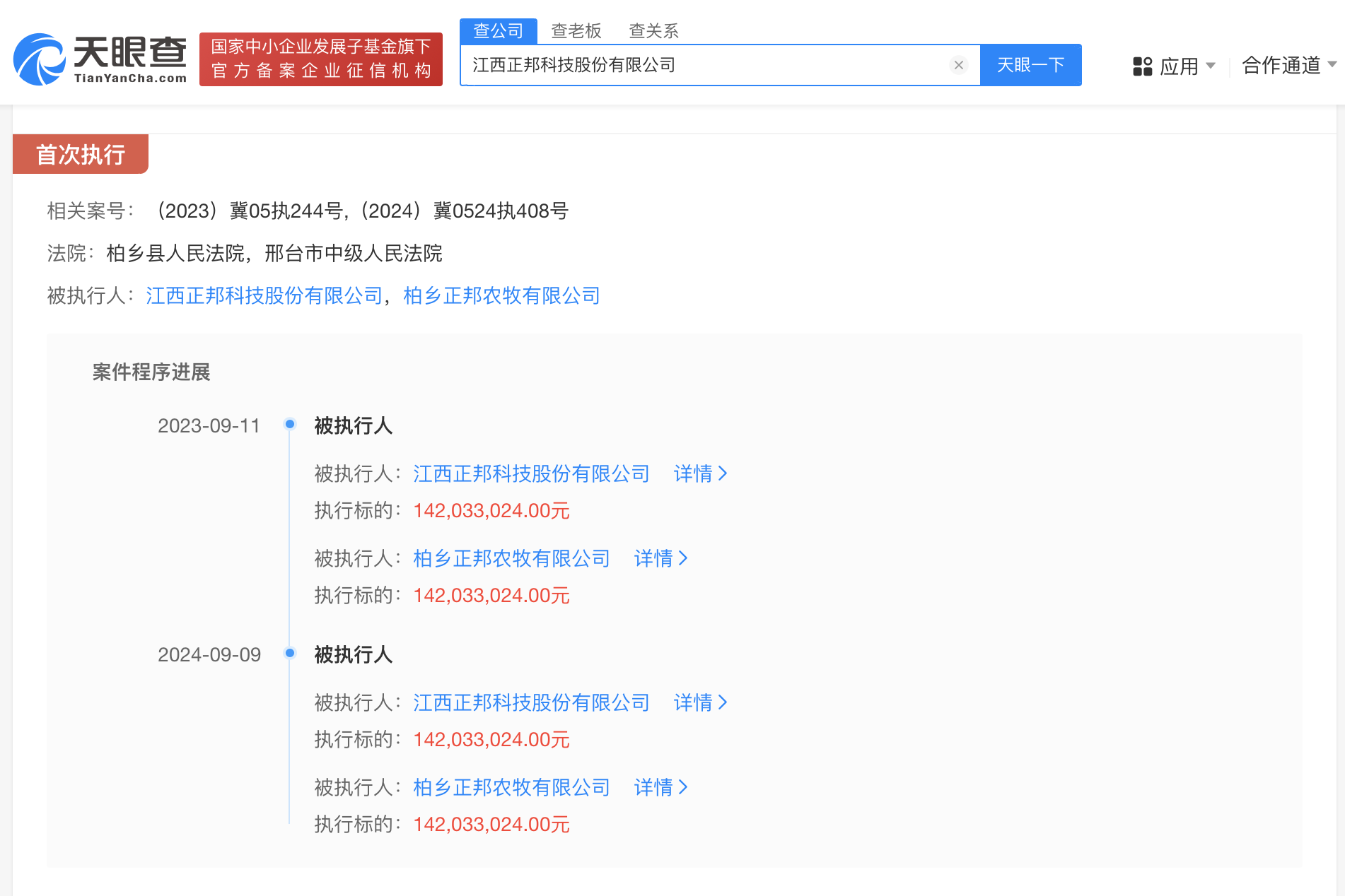 南方财经9月10日电,天眼查法律诉讼信息显示,近日,江西正邦科技股份有限公司、柏乡正邦农牧有限公司新增一条被执行人信息,执行标的1.42亿余元,涉及借款合同纠纷案件,执行法院为柏乡县人民法院。江西正邦科技股份有限公司成立于1996年9月,于2007年8月在A股上市,法定代表人为林峰,注册资本约30.74亿人民币,经营范围含畜禽饲料、预混料、饲料添加剂的研发、生产和销售等。