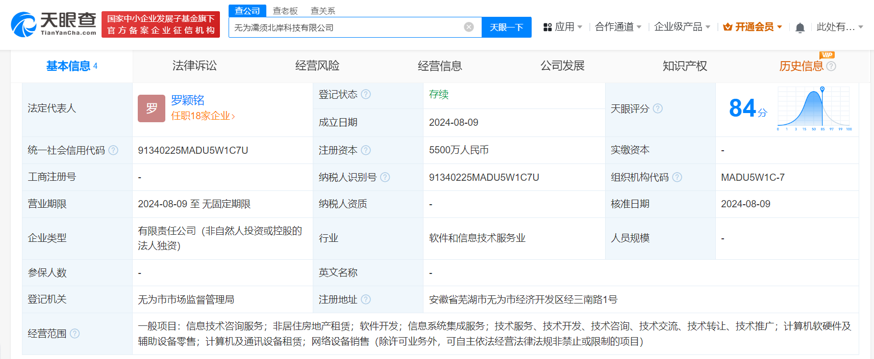 南方财经8月16日电,天眼查App显示,近日,无为濡须北岸科技有限公司成立,法定代表人为罗颖铭,注册资本5500万人民币,经营范围含信息技术咨询服务、非居住房地产租赁、软件开发、信息系统集成服务、计算机软硬件及辅助设备零售、网络设备销售等,由北京字跳网络技术有限公司全资持股。