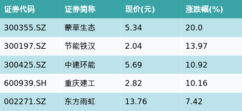 截至午间收盘,海绵城市主题涨跌幅最高的五只股票为:蒙草生态(300355.SZ)、节能铁汉(300197.SZ)、中建环能(300425.SZ)、重庆建工(600939.SH)与东方雨虹(002271.SZ)。详情见下表: