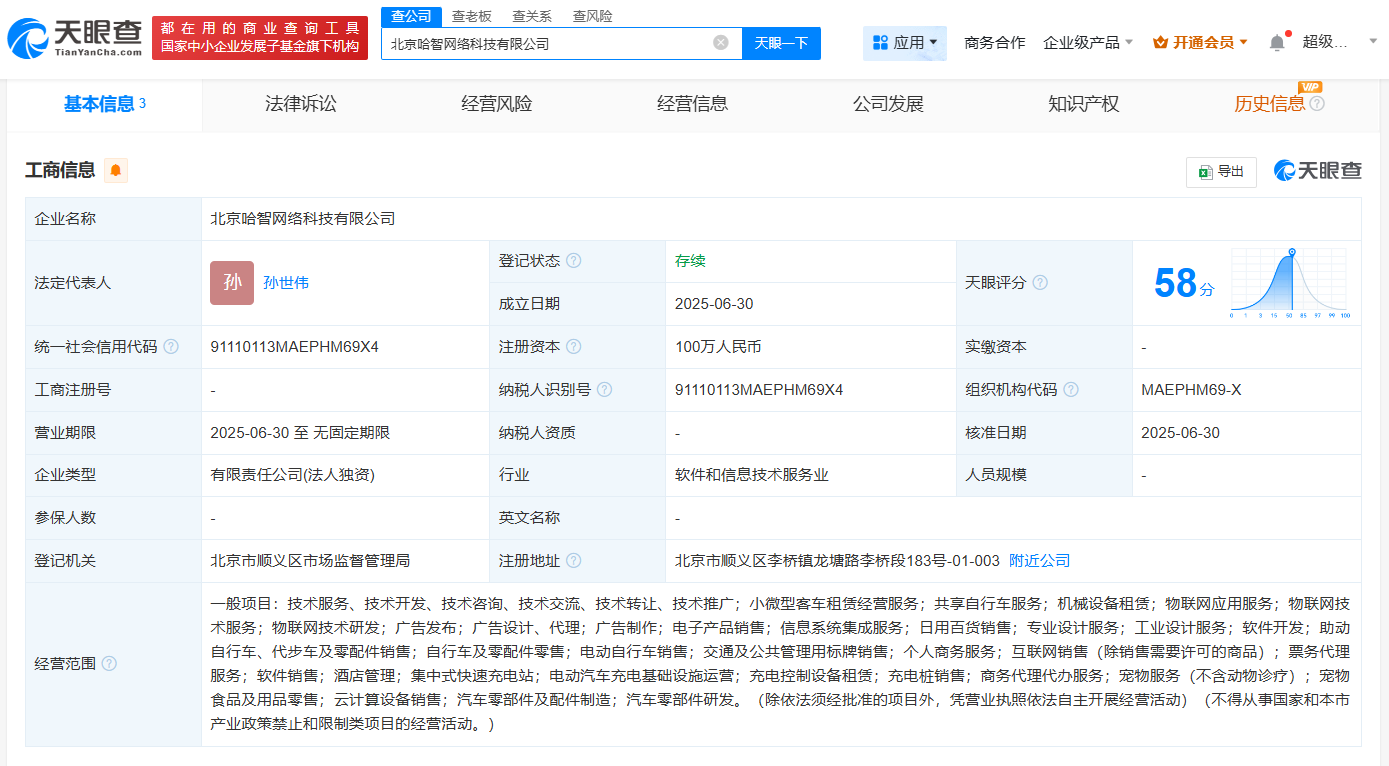 南方财经7月3日电,天眼查App显示,近日,北京哈智网络科技有限公司成立,法定代表人为孙世伟,注册资本100万人民币,经营范围包括物联网技术研发、集中式快速充电站、电动汽车充电基础设施运营等。股东信息显示,该公司由上海哈啰普惠科技有限公司全资持股。