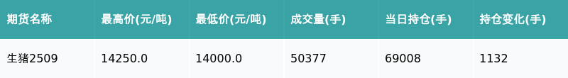 南财智讯7月16日电,南财金融终端盘后期货数据显示,大连商品交易所的生猪主力合约收跌1.89%,收盘报14010.0元/吨,日内资金流出110.32万元。其他相关指标见下表: