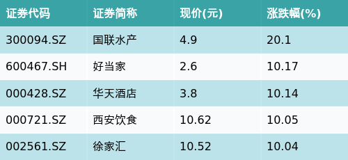 截至午间收盘,预制菜主题涨跌幅最高的五只股票为:国联水产(300094.SZ)、好当家(600467.SH)、华天酒店(000428.SZ)、西安饮食(000721.SZ)与徐家汇(002561.SZ)。详情见下表: