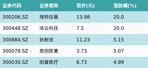 截至午间收盘,智能医疗主题涨跌幅最高的五只股票为:理邦仪器(300206.SZ)、浩云科技(300448.SZ)、狄耐克(300884.SZ)、思创医惠(300078.SZ)与阳普医疗(300030.SZ)。详情见下表: