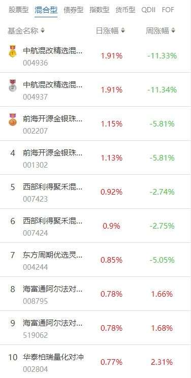 南方财经10月14日电,根据南财基金通数据:2024年10月11日当日收益靠前的混合型基金包括:中航混改精选混合型证券投资基金(004936,日收益1.91%);前海开源金银珠宝主题精选灵活配置混合型证券投资基金(002207,日收益1.15%);西部利得聚禾灵活配置混合型证券投资基金(007423,日收益0.92%)等。收益较低的股票型基金包括:同泰开泰混合型证券投资基金(007771,日收益-7.91%);长城久嘉创新成长灵活配置混合型证券投资基金(010052,日收益-7.55%);东方人工智能主题混合型证券投资基金(005844,日收益-7.13%)等。