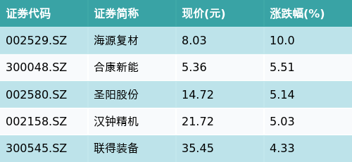截至早盘收盘,光伏概念主题涨跌幅最高的五只股票为:海源复材(002529.SZ)、合康新能(300048.SZ)、圣阳股份(002580.SZ)、汉钟精机(002158.SZ)与联得装备(300545.SZ)。详情见下表: