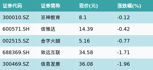 截至收盘,微信小程序主题涨跌幅最高的五只股票为:豆神教育(300010.SZ)、信雅达(600571.SH)、金字火腿(002515.SZ)、致远互联(688369.SH)与信息发展(300469.SZ)。详情见下表: