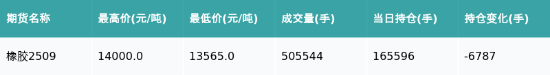 南财智讯6月13日电,南财金融终端盘后期货数据显示,上海期货交易所的橡胶主力合约收涨0.76%,收盘报13875.0元/吨,日内资金流出8835.71万元。其他相关指标见下表: