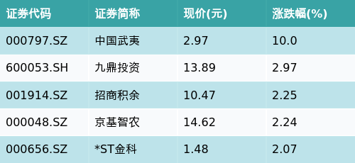 截至收盘,房地产开发主题涨跌幅最高的五只股票为:中国武夷(000797.SZ)、九鼎投资(600053.SH)、招商积余(001914.SZ)、京基智农(000048.SZ)与*ST金科(000656.SZ)。详情见下表: