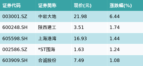 截至收盘,基建主题涨跌幅最高的五只股票为:中岩大地(003001.SZ)、陕西建工(600248.SH)、上海港湾(605598.SH)、*ST围海(002586.SZ)与合诚股份(603909.SH)。详情见下表: