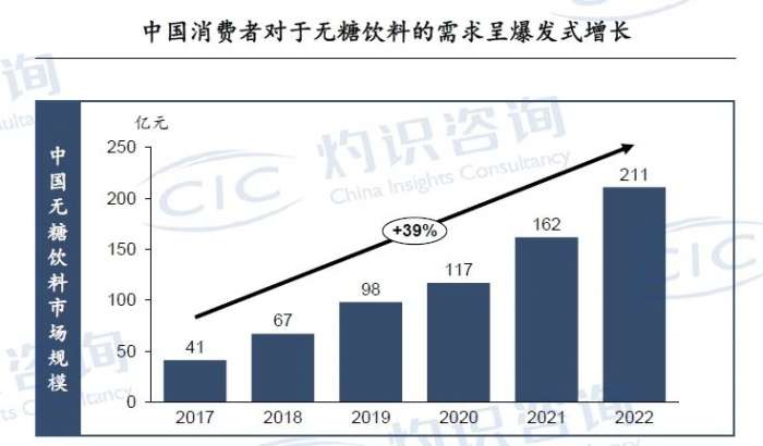 《中国营养健康食品行业蓝皮书》数据显示,中国无糖饮料市场2017—2022年迎来爆发式增长,市场规模从2017年的41亿元人民币增长到目前的211亿元人民币,饮料厂商推出以低糖、零糖为卖点的产品,多采用甜味剂作为食糖替代。