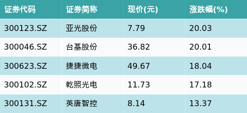 截至午间收盘,第三代半导体主题涨跌幅最高的五只股票为:亚光股份(300123.SZ)、台基股份(300046.SZ)、捷捷微电(300623.SZ)、乾照光电(300102.SZ)与英唐智控(300131.SZ)。详情见下表: