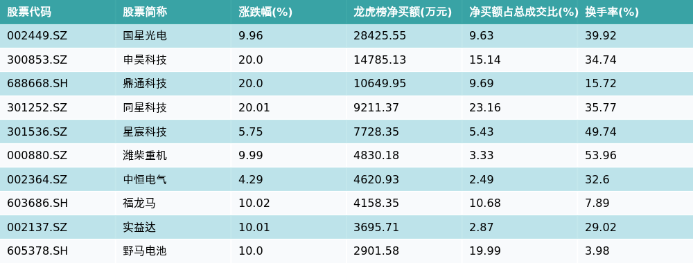 南方财经12月25日电,南财金融终端数据显示,因当日异动登上龙虎榜的个股中,资金净买入最多的前三位分别是国星光电(002449.SZ)、申昊科技(300853.SZ)与鼎通科技(688668.SH)。其中排名第一的国星光电净买额达2.84亿元,占总成交金额的9.63%。国星光电当日收盘上涨9.96%,换手率为39.92%,净买入额前10个股详情见下图: