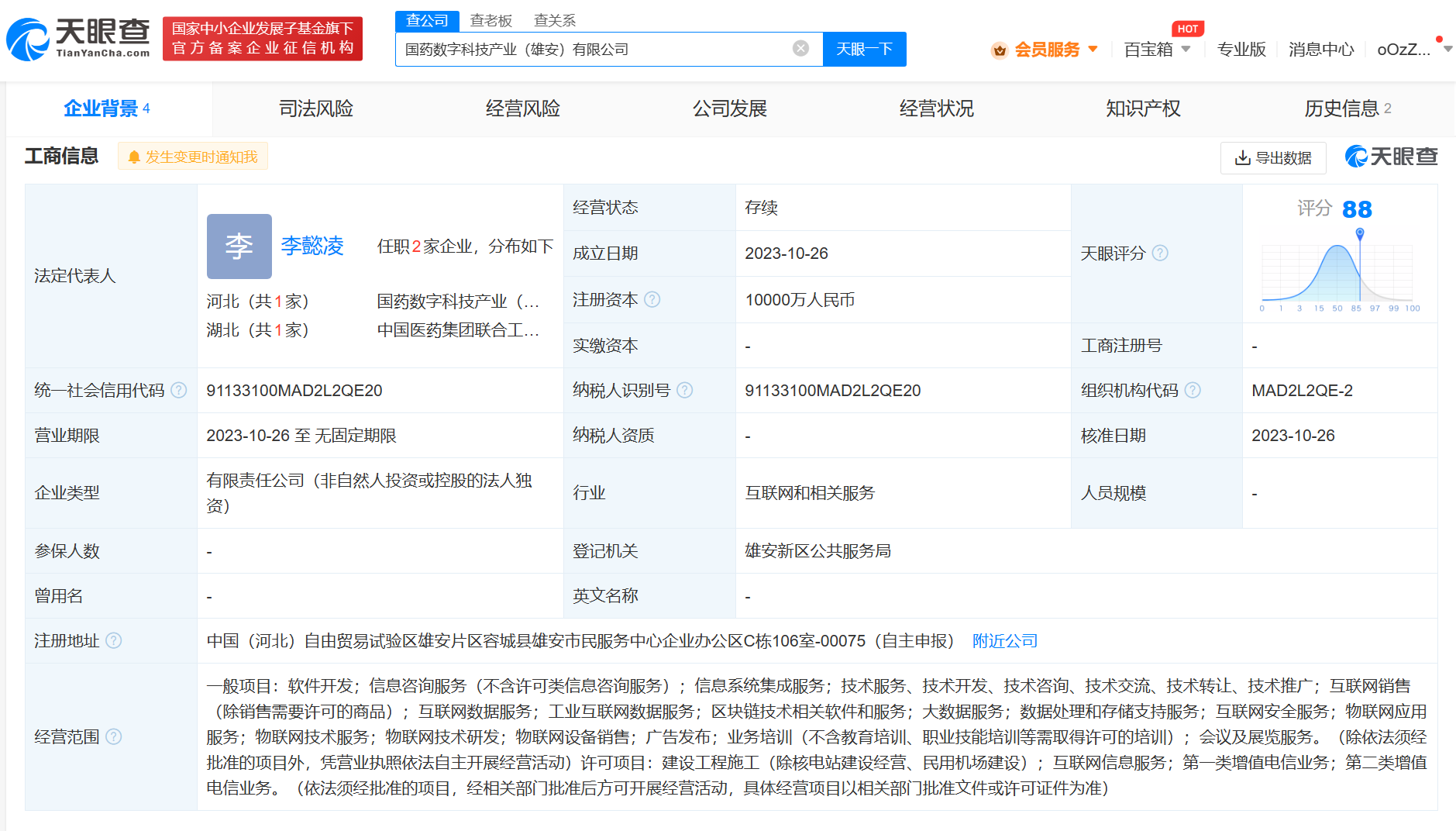 南方财经11月2日电,天眼查App显示,近日,国药数字科技产业(雄安)有限公司成立,法定代表人为李懿凌,注册资本1亿人民币,经营范围含软件开发、互联网销售、互联网数据服务、区块链技术相关软件和服务、大数据服务、物联网技术研发等。股东信息显示,该公司由中国医药集团有限公司全资持股。