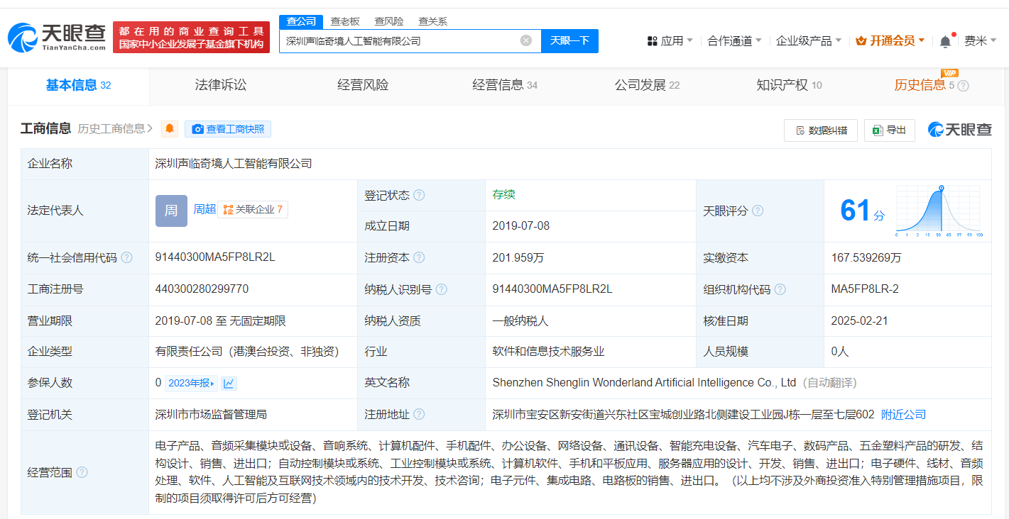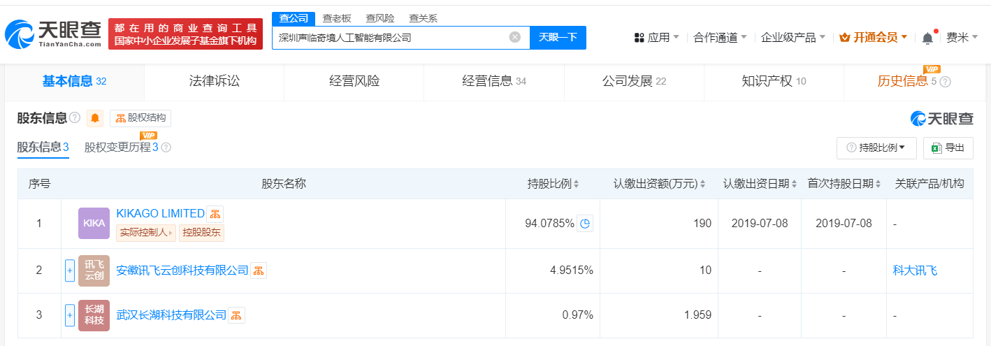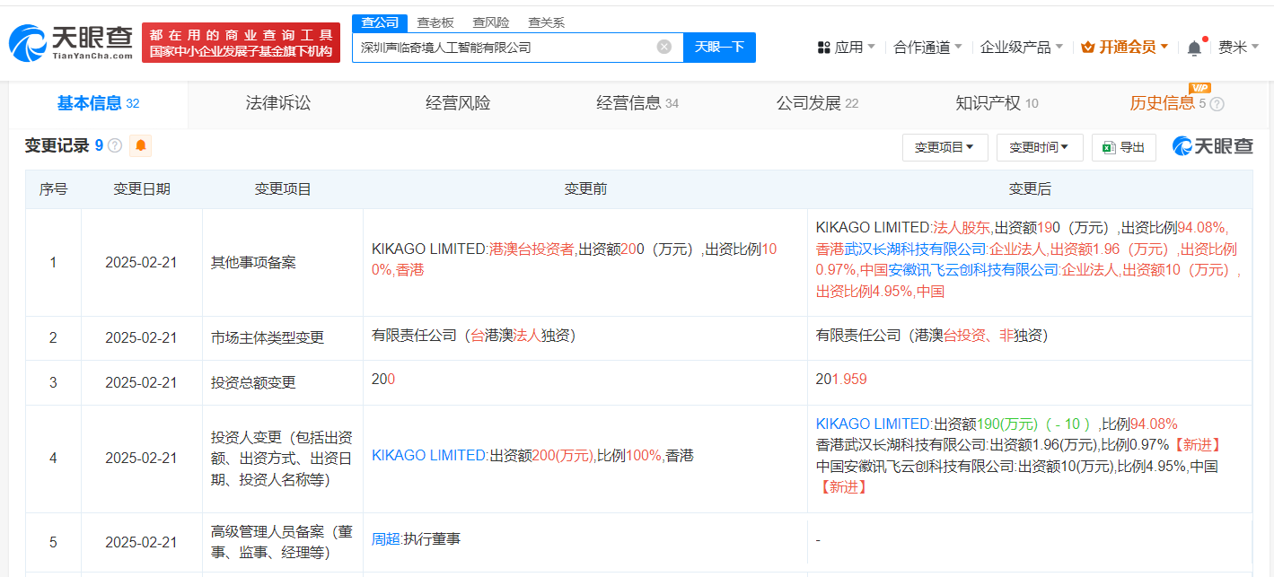 南方财经2月24日电,天眼查App显示,近日,深圳声临奇境人工智能有限公司发生工商变更,新增科大讯飞(002230)旗下安徽讯飞云创科技有限公司、武汉长湖科技有限公司为股东,同时注册资本由200万人民币增至约202万人民币。该公司成立于2019年7月,法定代表人为周超,经营范围含电子硬件、线材、音频处理、软件、人工智能及互联网技术领域内的技术开发、技术咨询等,现由KIKAGO LIMITED及上述新增股东共同持股。官网显示,该公司主要提供与语音相关的人工智能产品。