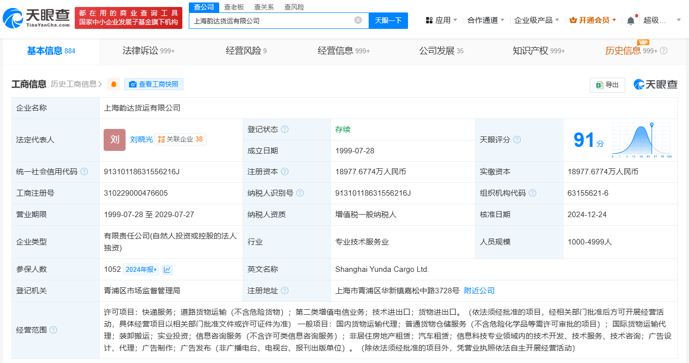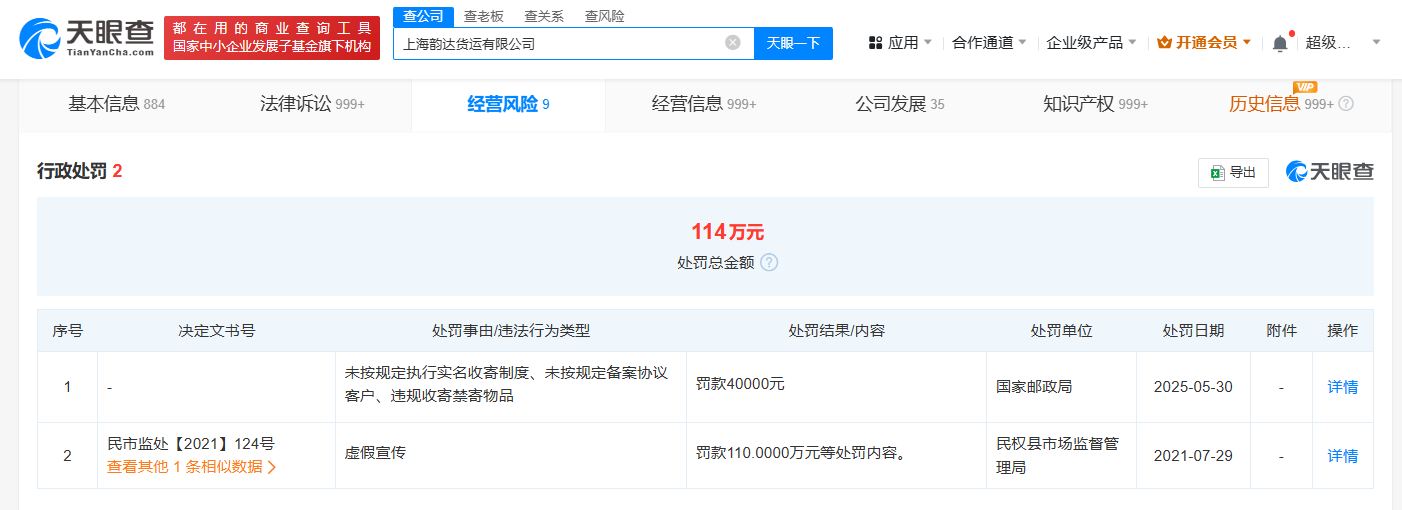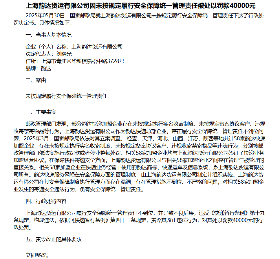 南方财经6月17日电,天眼查App显示,近日,上海韵达货运有限公司因未按规定履行安全保障统一管理责任,存在未按规定执行实名收寄制度、未按规定备案协议客户、违规收寄禁寄物品等行为,被国家邮政局罚款4万元。处罚事由显示,2025年3月,因韵达快递部分加盟企业对协议客户安全管理存在重大漏洞,导致涉诈骗宣传品进入寄递渠道,国家邮政局依法对该公司立案调查。经查,天津、河北、山西、江苏、陕西等地共计58家韵达快递加盟企业,存在未按规定执行实名收寄制度、未按规定备案协议客户、违规收寄禁寄物品等违法行为,分别被邮政管理部门依法实施行政罚款或者停业整顿处罚。上海韵达货运有限公司成立于1999年7月,法定代表人为刘晓光,注册资本约1.9亿人民币,由韵达股份(002120)全资持股。