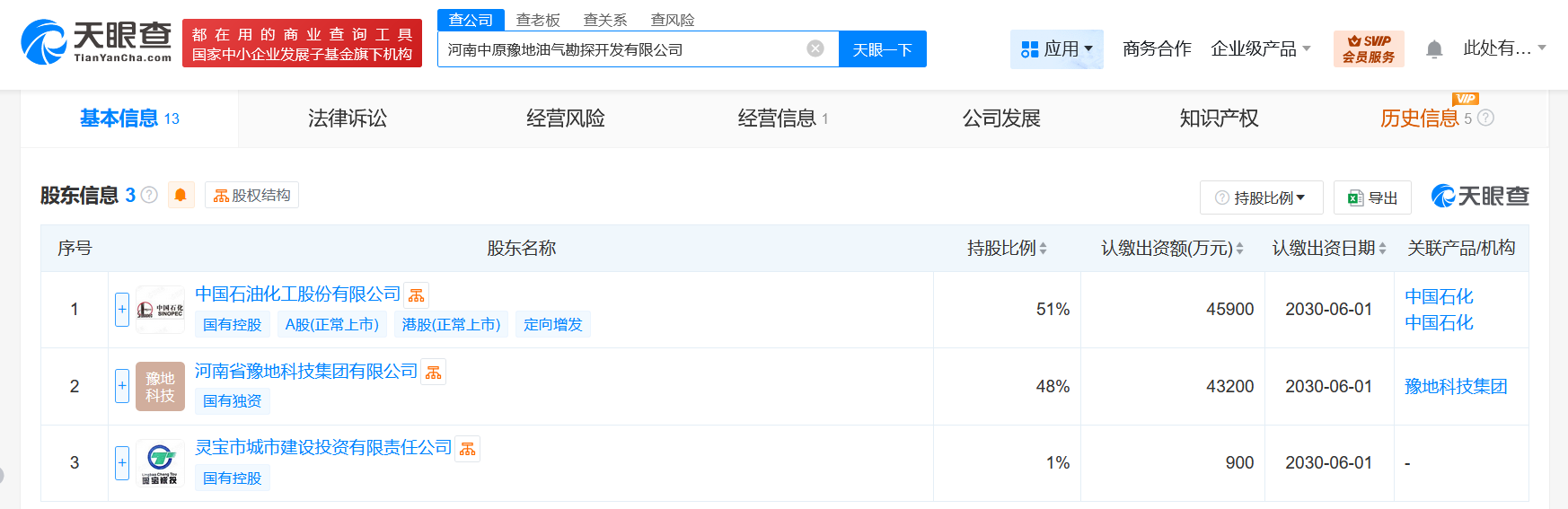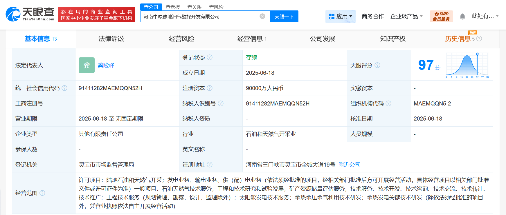 南方财经6月23日电,天眼查App显示,近日,河南中原豫地油气勘探开发有限公司成立,法定代表人为龚险峰,注册资本9亿人民币,经营范围含陆地石油和天然气开采,发电业务、输电业务、供(配)电业务,石油天然气技术服务,工程和技术研究和试验发展,矿产资源储量评估服务等。股东信息显示,该公司由中国石化(600028)、河南省豫地科技集团有限公司、灵宝市城市建设投资有限责任公司共同持股。