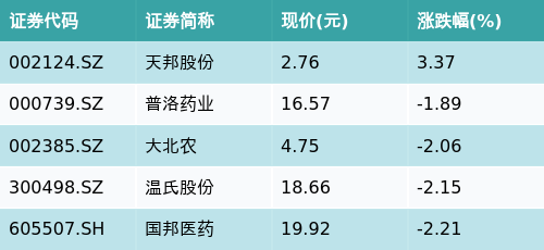 截至收盘,动物保健主题涨跌幅最高的五只股票为:天邦股份(002124.SZ)、普洛药业(000739.SZ)、大北农(002385.SZ)、温氏股份(300498.SZ)与国邦医药(605507.SH)。详情见下表: