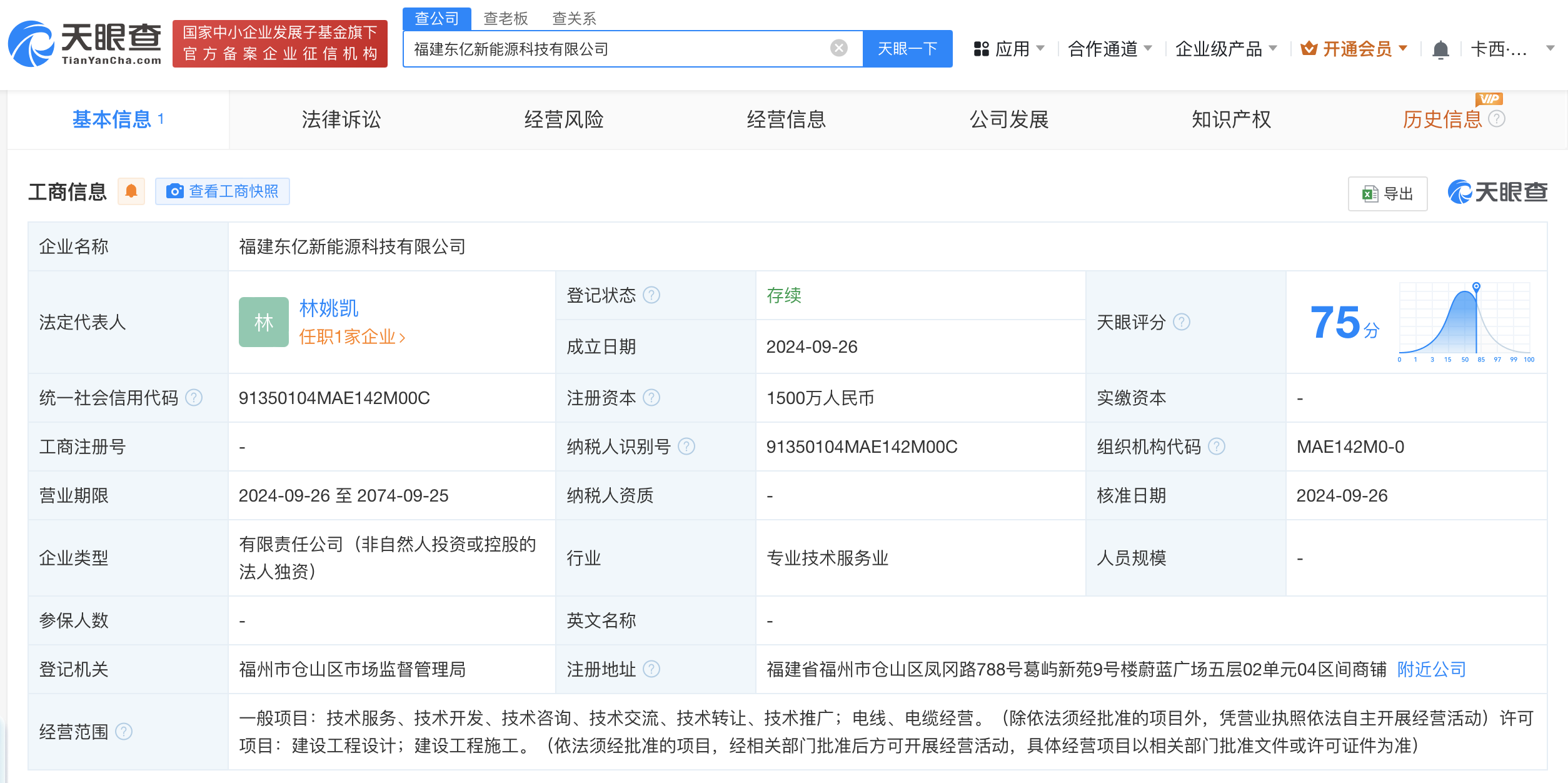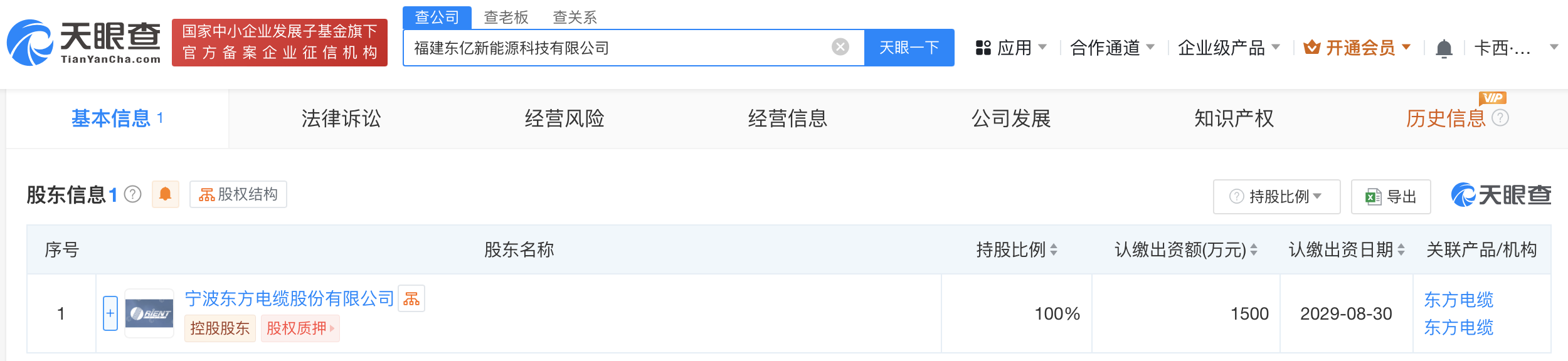 南方财经10月12日电,天眼查App显示,近日,福建东亿新能源科技有限公司成立,法定代表人为林姚凯,注册资本1500万人民币,经营范围含电线、电缆经营,建设工程设计,建设工程施工等。股东信息显示,该公司由东方电缆(603606)全资持股。