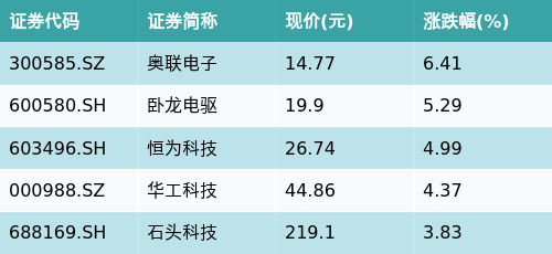 截至午间收盘,机器人概念主题涨跌幅最高的五只股票为:奥联电子(300585.SZ)、卧龙电驱(600580.SH)、恒为科技(603496.SH)、华工科技(000988.SZ)与石头科技(688169.SH)。详情见下表: