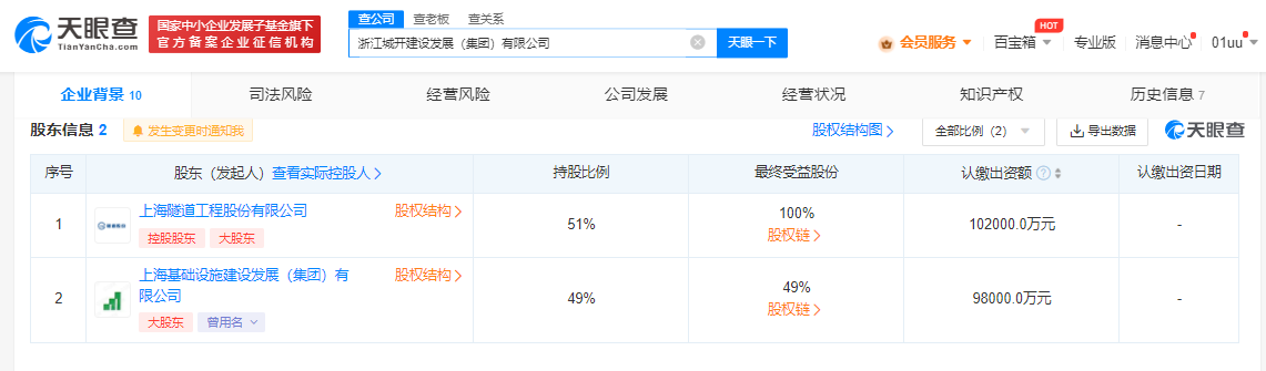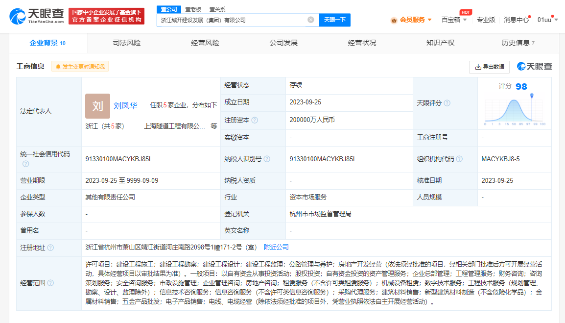 南方财经9月28日电,天眼查App显示,近日,浙江城开建设发展(集团)有限公司成立,法定代表人为刘凤华,注册资本20亿人民币,经营范围包括建设工程施工、公路管理与养护、房地产开发经营、以自有资金从事投资活动、股权投资、自有资金投资的资产管理服务等。股东信息显示,该公司由隧道股份(600820)、上海基础设施建设发展(集团)有限公司分别持股51%、49%。