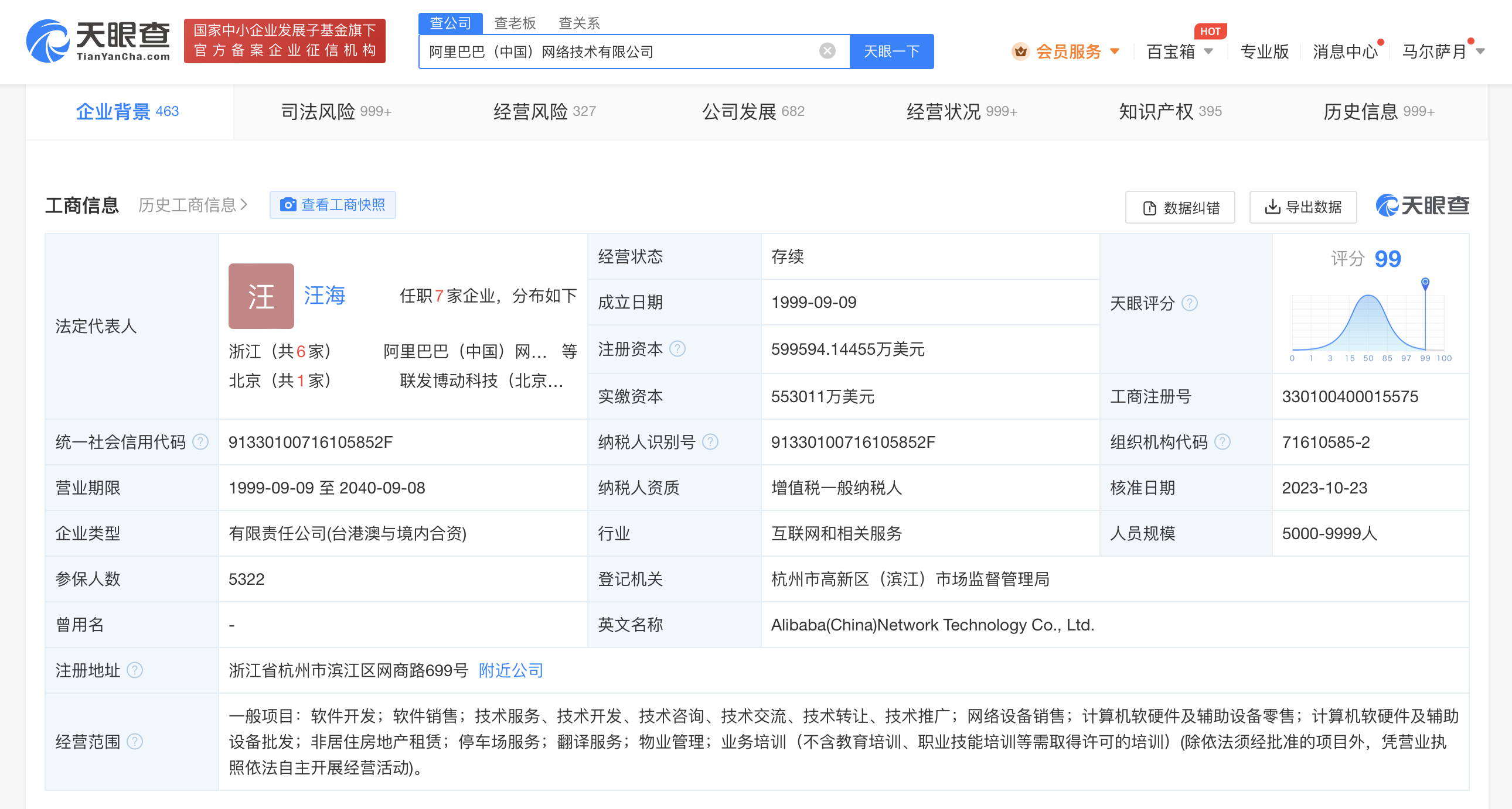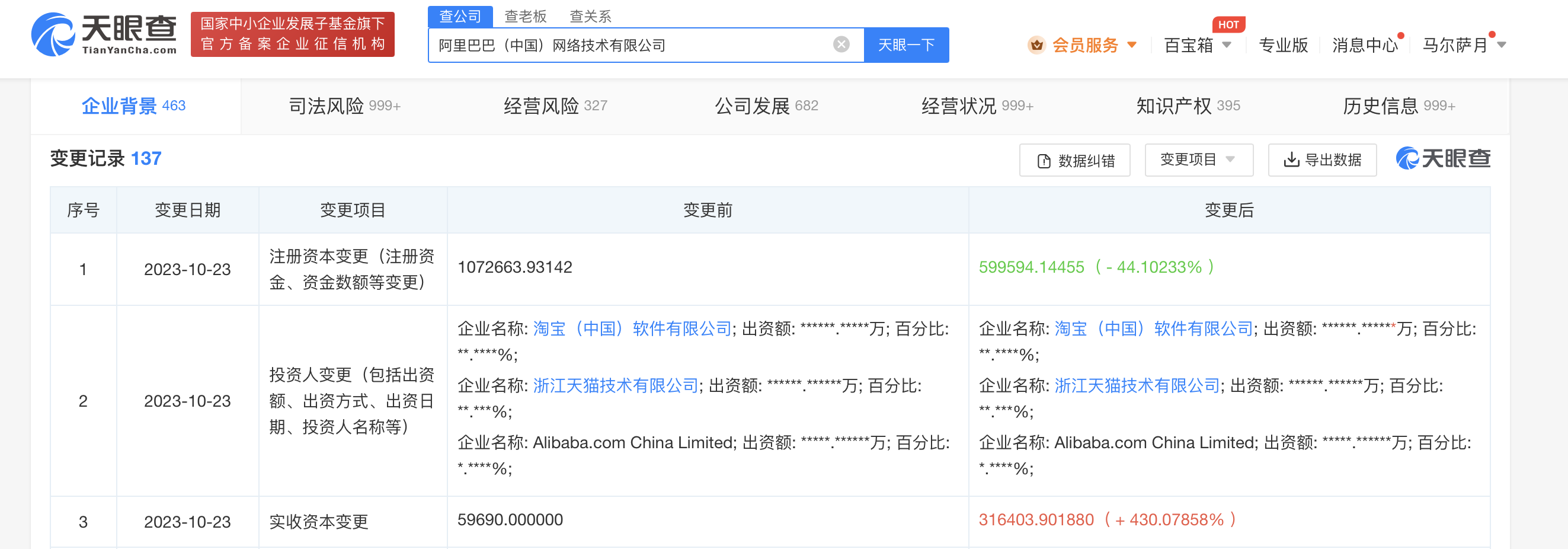 阿里巴巴(中国)网络技术公司减资至59亿美元