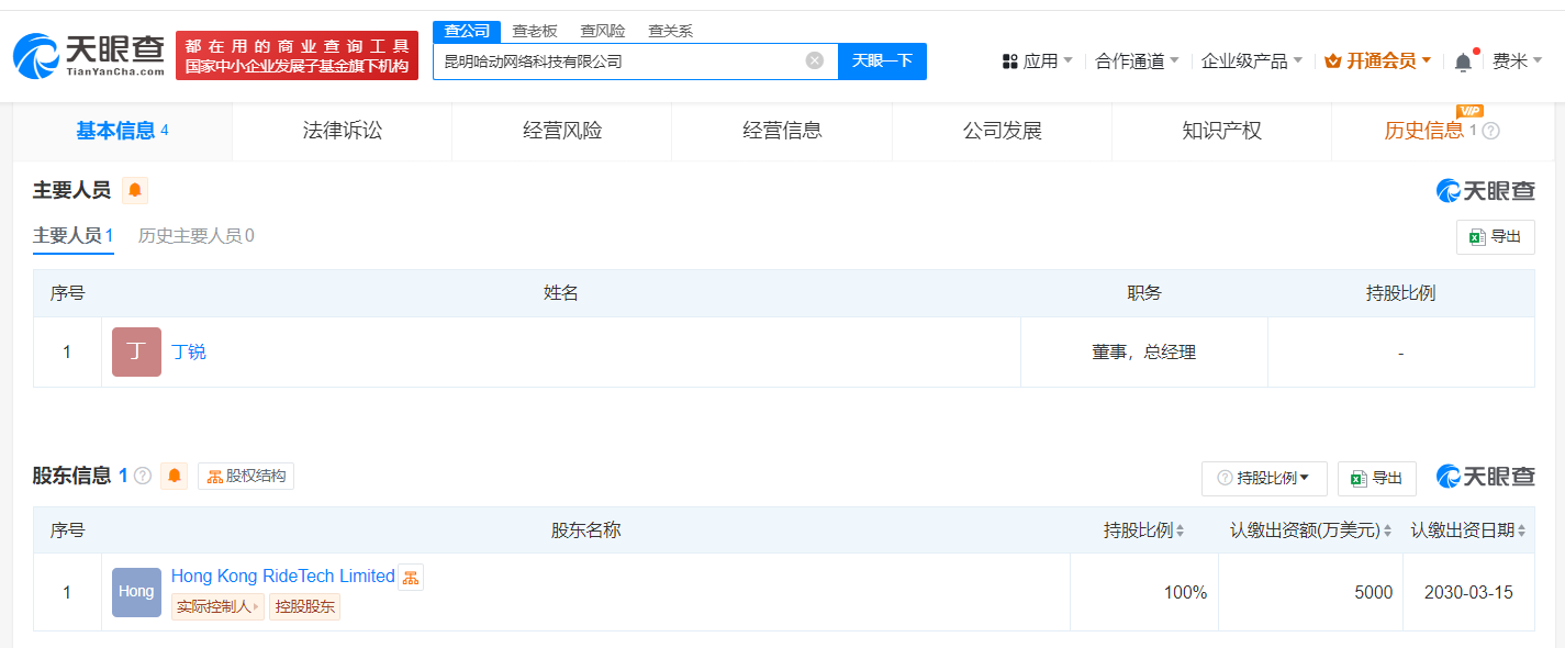 哈啰在昆明成立网络科技公司 注册资本5000万美元