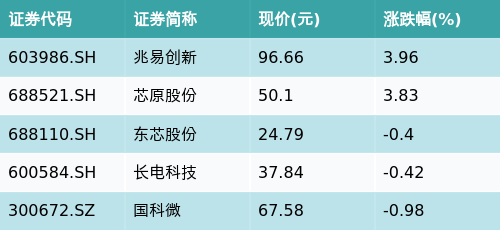 截至收盘,国家大基金持股主题涨跌幅最高的五只股票为:兆易创新(603986.SH)、芯原股份(688521.SH)、东芯股份(688110.SH)、长电科技(600584.SH)与国科微(300672.SZ)。详情见下表: