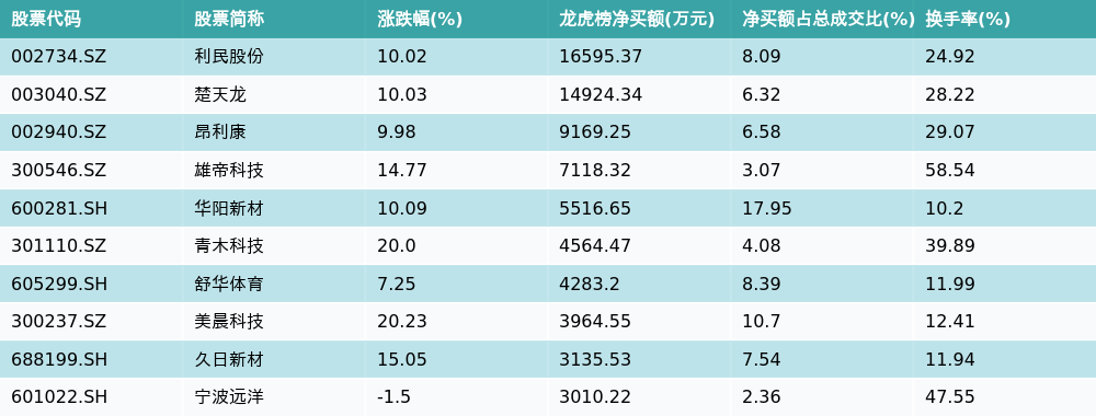 南财智讯6月11日电,南财金融终端数据显示,因当日异动登上龙虎榜的个股中,资金净买入最多的前三位分别是利民股份(002734.SZ)、楚天龙(003040.SZ)与昂利康(002940.SZ)。其中排名第一的利民股份净买额达1.66亿元,占总成交金额的8.09%。利民股份当日收盘上涨10.02%,换手率为24.92%,净买入额前10个股详情见下图: