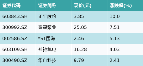 截至收盘,水利建设主题涨跌幅最高的五只股票为:正平股份(603843.SH)、泰福泵业(300992.SZ)、*ST围海(002586.SZ)、神驰机电(603109.SH)与华自科技(300490.SZ)。详情见下表: