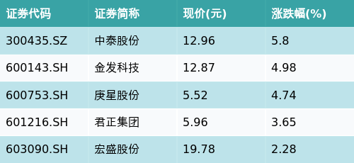 截至收盘,煤化工主题涨跌幅最高的五只股票为:中泰股份(300435.SZ)、金发科技(600143.SH)、庚星股份(600753.SH)、君正集团(601216.SH)与宏盛股份(603090.SH)。详情见下表: