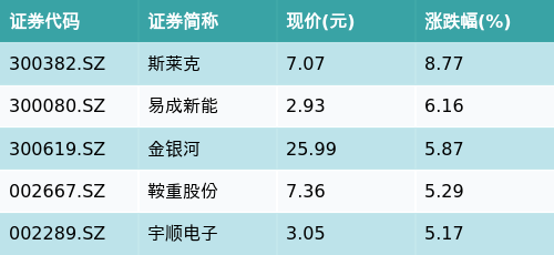 截至午间收盘,锂电池概念主题涨跌幅最高的五只股票为:斯莱克(300382.SZ)、易成新能(300080.SZ)、金银河(300619.SZ)、鞍重股份(002667.SZ)与宇顺电子(002289.SZ)。详情见下表: