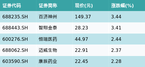 截至午间收盘,单抗概念主题涨跌幅最高的五只股票为:百济神州(688235.SH)、智翔金泰(688443.SH)、恒瑞医药(600276.SH)、迈威生物(688062.SH)与康辰药业(603590.SH)。详情见下表: