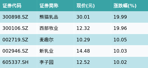 截至午间收盘,乳业主题涨跌幅最高的五只股票为:熊猫乳品(300898.SZ)、西部牧业(300106.SZ)、麦趣尔(002719.SZ)、新乳业(002946.SZ)与李子园(605337.SH)。详情见下表: