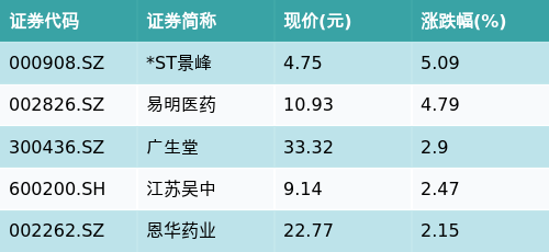 截至收盘,仿制药一致性评价主题涨跌幅最高的五只股票为:*ST景峰(000908.SZ)、易明医药(002826.SZ)、广生堂(300436.SZ)、江苏吴中(600200.SH)与恩华药业(002262.SZ)。详情见下表: