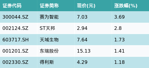 截至午间收盘,猪肉主题涨跌幅最高的五只股票为:赛为智能(300044.SZ)、ST天邦(002124.SZ)、天域生物(603717.SH)、东瑞股份(001201.SZ)与得利斯(002330.SZ)。详情见下表: